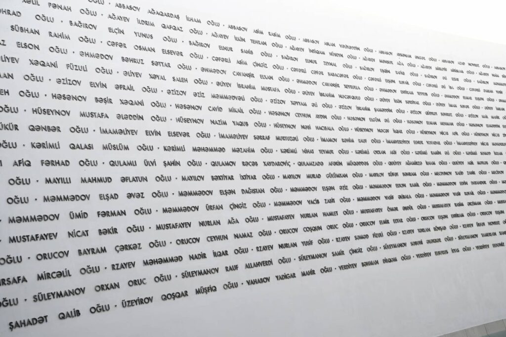 Muzeyin girişində tarixi Qələbənin rəmzinə çevrilmiş “Dəmir yumruq” instalyasiyası və Müzəffər Ali Baş Komandan, Prezident İlham Əliyevin çıxışından fikirlər əks olunur. Muzeyi əhatə edən divarda 44 günlük Vətən müharibəsində şəhid olmuş qəhrəmanlarımızın adı ehtiram əlaməti kimi həkk edilib. Divarboyu axan su daimi həyat mənbəyi kimi şəhidlərimizin qəhrəmanlıqları ilə ölümsüzlüyə qovuşduqlarını, hər zaman qəlbimizdə yaşadıqlarını simvolizə edir. Muzeyin ekspozisiya zallarında isə Qarabağda Vətən müharibəsinədək və Zəfər Günündən sonra həlak olmuş şəhidlərimizin adları var.