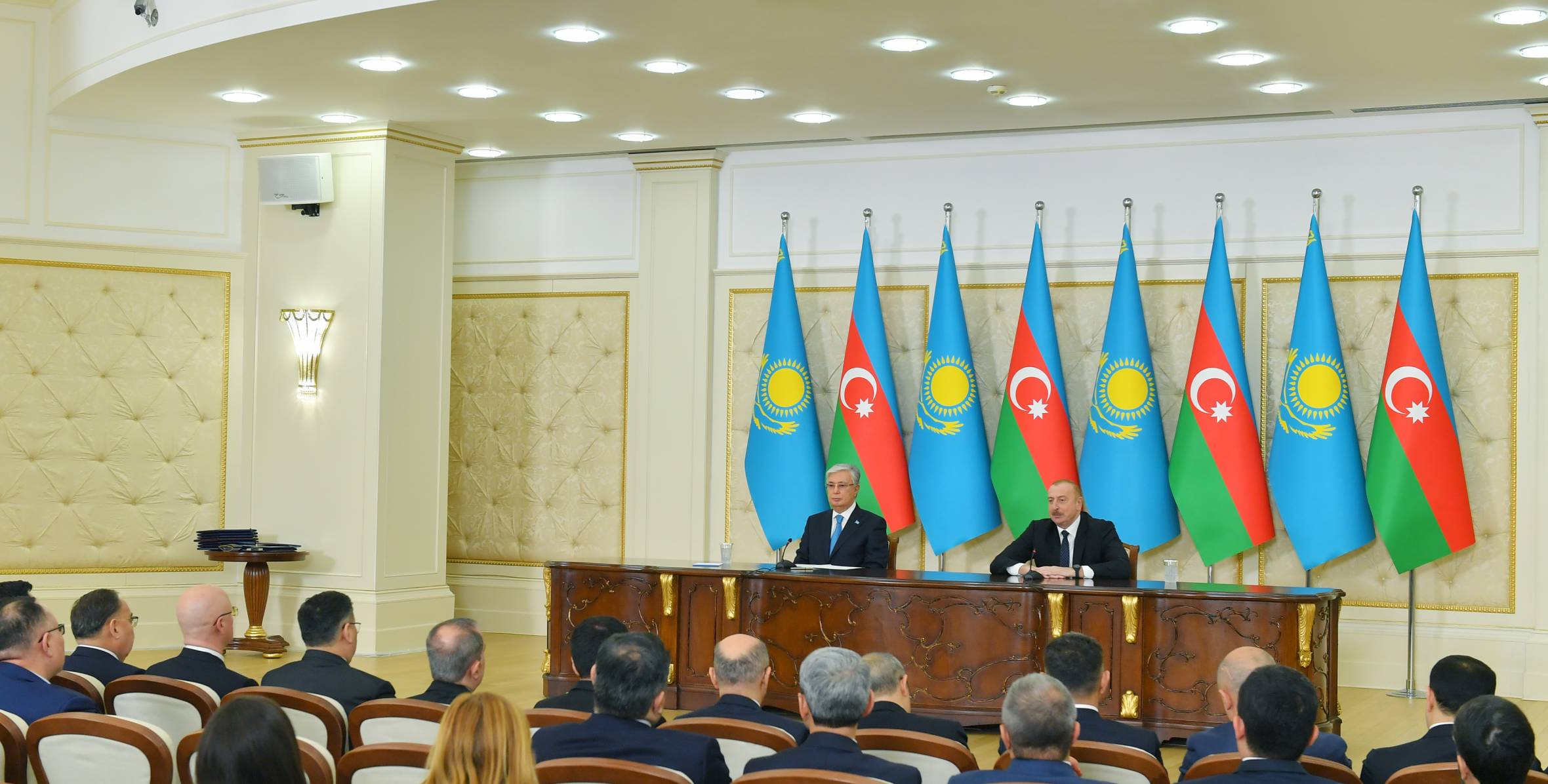 Azərbaycan Respublikasının Prezidenti İlham Əliyev və Qazaxıstan Respublikasının Prezidenti Kasım-Jomart Tokayev mətbuata bəyanatlarla çıxış ediblər.