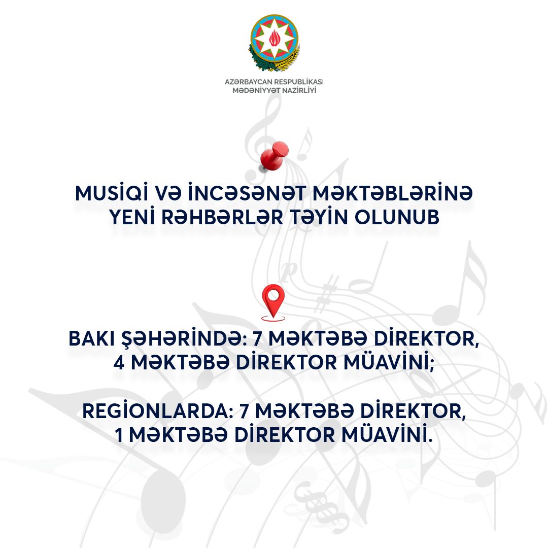 Mədəniyyət Nazirliyinin tabeliyində fəaliyyət göstərən musiqi və incəsənət məktəb və mərkəzlərinə yeni rəhbər təyinatları həyata keçirilib. Nazirlik tərəfindən təşkil olunmuş açıq müsabiqənin nəticələrinə əsasən test və müsahibə mərhələlərindən uğurla keçmiş 19 namizəd rəhbər vəzifələrə irəli çəkilib.